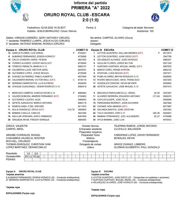 El partido que cerró la jornada sabatina dentro de la segunda fecha del campeonato orureño, se cumplió entre los elencos de Oruro Royal y Deportivo Escara, el primero llegaba a este compromiso con una dura derrota sufrida a manos de deportivo Shalon, en tanto que los “blues” habían conseguido un buen triunfo sobre el plantel de San Isidro que los dejaba dentro de las primeras posiciones.