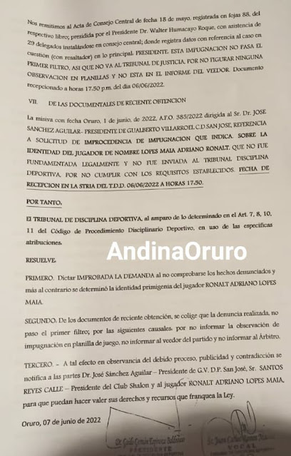 En el segundo caso el TDJ no encontró razón alguna del reclamo de suplantación de jugador de parte de GV San José por lo que dicho reclamo también queda en nada, en consecuencia no habrá modificaciones en la tabla de posiciones y los clubes que clasifican a la Copa “Simón Bolívar” son Deportivo Shalon en calidad de campeón, Sur-Car como segundo y CDT Real Oruro en tercer lugar.